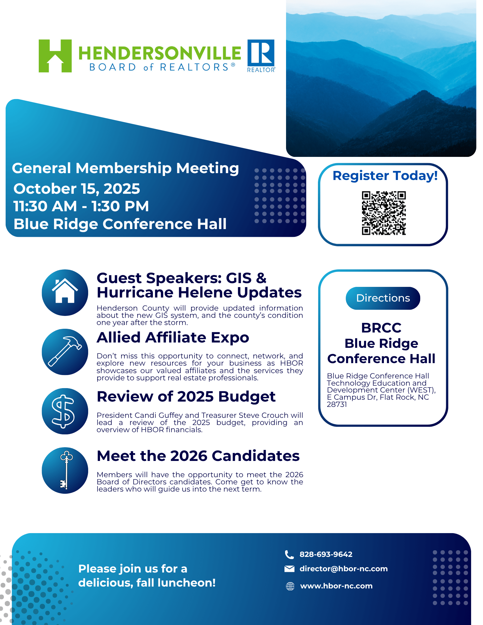 We are excited to invite you to the upcoming Hendersonville Board of REALTORS General Membership Meeting on Wednesday, October 15th at the BRCC Blue Ridge Conference Hall from 11:30 to 1:30. Join us as we welcome guest speakers from Henderson County as they provide an overview of the county's new GIS system, highlighting its features and applications. They will also share important updates on Henderson County's ongoing recovery efforts following Hurricane Helene. Lunch is being catered by Mini-Batch Bakery.